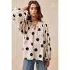 This polka dot blouse features exaggerated balloon sleeves for a dramatic and fashion-forward look. The playful polka dot print adds a whimsical touch to the blouse. The exaggerated balloon sleeves make a statement and add volume to the overall silhouette. Perfect for adding a touch of fun and flair to your outfit, this blouse is a versatile piece that can be dressed up or down. Elevate your style with this trendy blouse that combines bold sleeves with a classic print.
