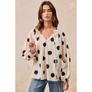 This polka dot blouse features exaggerated balloon sleeves for a dramatic and fashion-forward look. The playful polka dot print adds a whimsical touch to the blouse. The exaggerated balloon sleeves make a statement and add volume to the overall silhouette. Perfect for adding a touch of fun and flair to your outfit, this blouse is a versatile piece that can be dressed up or down. Elevate your style with this trendy blouse that combines bold sleeves with a classic print.