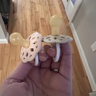 [This review was collected as part of a promotion.] I bought these pacifiers for my almost two year old. She is a thumb sucker so we are trying to actually get her off. I am also a sucker for these kind of muted colors. The pretty pink is not the typical pink you see with baby products, the tan color is definitely not a typical baby color. The open cut out print of the pacifier is also reassuring for little babies to breath better. Lastly the glow in the dark !! How cool is that. My daughter is able to easily find it in the middle of the night. These are a win ! I received an incentive to write this review.