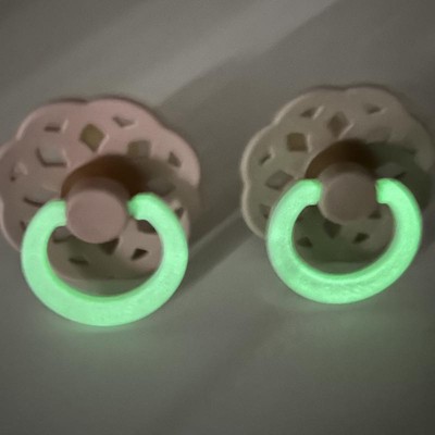 [This review was collected as part of a promotion.] I LOVE glow in the dark pacifiers and these are perfect. I like that the rings are the part that glow to allow little hands to find and grab in the middle of the night. They are true to size (infant and up). They have a cut out floral pattern on the base to allow good airflow to prevent chapped mouths. They are lightweight and made of natural rubber. They are a matte pink blush color and a neutral tan matte color. I received an incentive to write this review.