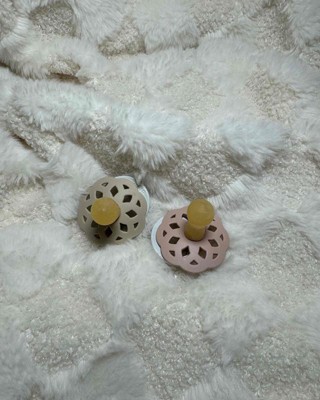 [This review was collected as part of a promotion.] These pacifiers are adorable. The colors are a neutral tan color and a soft blush pink color. The rubber is a latex rubber. The fit easily into my baby's mouth. They plates sit nicely on her face and don't cause any rashes on her face. My baby loves to hold the handles and pull them in and out of her mouth as well. These make perfect baby shower gifts as well? They are 6-18months. I received an incentive to write this review.