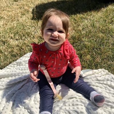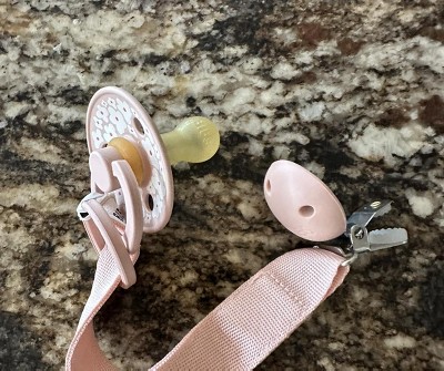My daughter is notoriously picky about pacis. We’ve bought so many different kinds, and she just isn’t interested in them. However, the material (natural rubber!) and shape of this paci are a great match for her. My daughter is currently teething, and she enjoys the stimulation. The strap is also convenient for keeping it clipped to her clothes—she does enjoy spitting it out and putting it back in on her own. Thanks to stellar product testing panel for sending this to us.