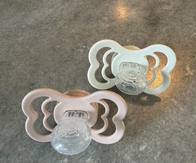 My pacifier loving toddler enjoys these, despite always using a slant style pacifier in the past. My pacifier hating 6mo did not take to these, but that was not unexpected. I prefer a single piece silicone style and something with a small loop to connect a clip on. This does the trick and is well made, just not my or our families personal choice. I received this product as part of the Stellar Product Testing Panel.