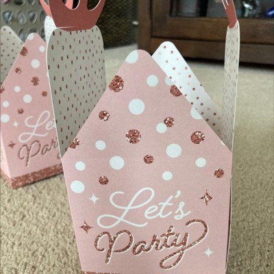 Bow Boxes INCLUDE: 12 Pink Rose Gold Birthday-themed square favor gift boxes. Each box SIZE measures 3.5 inches length x 3.5 inches width x 7 inches height. Bow boxes are ideal for small gifts and treats that are under 3.5 inches tall (height for storing items in closed box). When assembled and closed, each box creates a 3D paper bow-shaped top with a square bottom. CUTE GIFT BOXES: This small, closed favor box can be filled with homemade treats (fun cupcake box), party trinkets, or thank you gifts. At the party, have each guest fill their Pretty Pink bow box with snacks from a candy buffet or use as a party loot box. Guests will have fun guessing what surprise each favor gift box contains. PREMIUM PARTY SUPPLY: Bow boxes are professionally printed and double-sided on heavy-duty cardstock paper, with a photo-like shine. They are hand-folded, individually inspected, and then carefully packaged. EASY ASSEMBLY: Pink Rose Gold Birthday bow boxes will arrive flat. Each bow box has crease lines and numbered tabs for easy folding. Finish the DIY assembly by interlocking top of box to create a three-dimensional bow. Packaging will include assembly instructions. MADE IN THE USA: Pretty Pink Birthday Party bow boxes are designed and manufactured at our Wisconsin facility using materials that are Made in the USA. Pink Rose Gold Birthday bow boxes use a No-Mess Glitter Print: Our DIY favor boxes are designed with a printed image of glitter, eliminating glitter flake while maximizing bling effect!