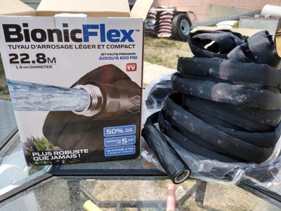 [This review was collected as part of a promotion.] The Bionic Flex Hose - 75ft looks like a good product, it is light, strong, the metal connections seem quite strong, and it is very practical but I received a product that was not factory packed and stained with an apparent very nasty type of fungus, obvious that this can be eliminated and being for external use I do not think it represents a major problem but it was very disappointing.
