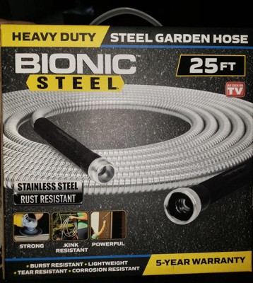 [This review was collected as part of a promotion.] I got this product it's a Bionic steel water hose it is a 25 ft hose stainless steel and rust resistant it is strong and kinda powerful it is burst resistant and tear resistant and corrosion resistant to I liked everything about it except that it can get really hot if you don't have a cool place to keep it