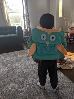 My 3 year old is obsessed with wearing her older sister's backpack and I was so excited to get this cute backpack for her to use. The owl print is so cute and looks different enough from other backpacks that I think it would be easy to spot her backpack amongst other kids' backpacks. But even if I did lose it, there is an ID card holder under the flap :) The backpack feels well made and pretty durable. I feel like the backpack would be pretty easy to clean, but the wings are made of like a felt material that I think would stain more easily. It comes with a main compartment with two zippers on it. The main compartment was large enough to fit a folder and notebook and even fit a 1" binder snugly. This is a big deal, considering a lot of backpacks made for preschoolers, especially some animal-themed ones, are much too small to fit folders. We were also able to put a pack of colored pencils in one of the inside pockets and a pack of crayons in the other inside pocket. Then I was able to fit a pencil pouch in the smaller outside pocket that closes with a velcro'd flap. There are two side pockets for water bottles and we were able to fit a Thermos water bottle in there easily. I know the horizontal design is supposed to keep the backpack from hanging too low, but I felt like it was then too wide on my 3 year old. It fit much better on my 5 year old. My 3 year old is still getting used to the shape but it may just be something she will have to grow into.