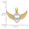 Interlocking hearts soar with diamond cut open wings fashioned from 14k yellow gold and white rhodium plating. This symbolic pendant measures approximately 23mm wide by 15mm long, which includes the tapered bail. Chain not included. Additional features include: polished 14k yellow gold & rhodium design; approximate size 23 x 15mm with the bail; made in the u.s.a.; average weight is 0.55 grams.