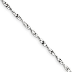 This gorgeous herringbone chain with its twisted, brightly polished design looks incredible with dark or fair complexions. It is styled from sterling silver, measures 2mm in width and closes with a classic lobster claw clasp. Additional features include: crafted with sterling silver; 2 mm in width; herringbone style chain; closes with a lobster claw clasp.