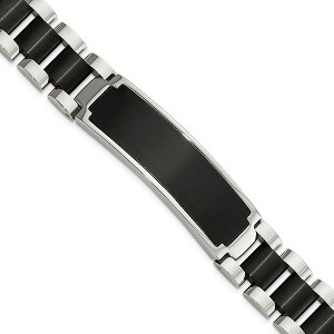 Precision details, clean lines and a distinctive style will take you from the office to a night out on the town. Crafted from brushed, polished and black plated stainless steel. This two-tone ID link bracelet is approximately 16mm (5/8 inch) in width by 8.5 inches in length including the fold over clasp. Suitable for engraving. Additional features include: two-tone, stainless steel & black plated; suitable for engraving; approximate size is 16mm width x 8.5 in length; average item weight is 69.58 grams.
