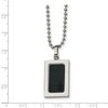 This stainless steel necklace features a black carbon fiber inset and a 22 inch ball chain finished with a fancy lobster clasp. The polished rectangular pendant measures approximately 5/8 inches by 1 3/8 inch including the bail. Additional features include: polished 316l stainless steel; black carbon fiber inset; 1 3/8 inch pendant on a 22 inch ball chain; weight is approximately 15.71 grams.