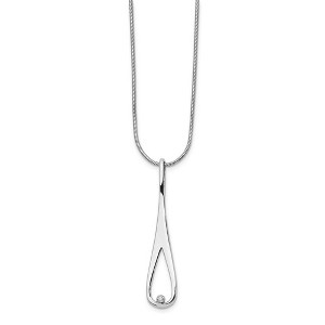 A simplistic design with timeless style featuring a diamond accented teardrop pendant on an adjustable 1mm snake chain fashioned from tarnish resistant rhodium plated sterling silver. The polished pendant is approximately 8mm (5/16 inch) in width by 39mm (1 1/2 inch) in length. The snake chain is finished with a lobster clasp and 2-inch extension that allows you to change the length from 18 to 20 inches. The natural .01 carat diamond is I2 in clarity and H-I in color. Additional features include: tarnish resistant, rhodium plated sterling silver; natural diamond, i2 clarity, h-i color, .01 ct; approximate pendant size 8 x 39mm; weight is approximately 1.04 grams.