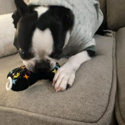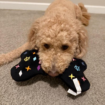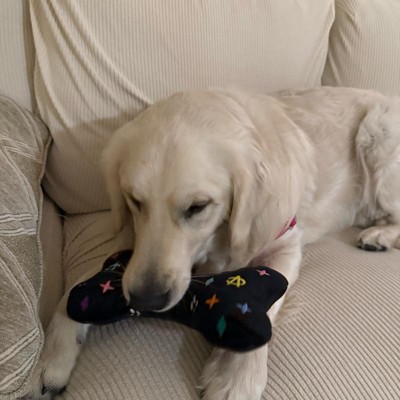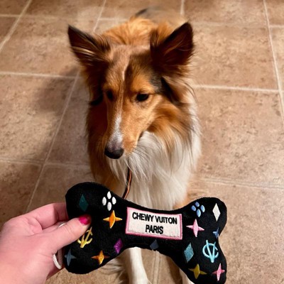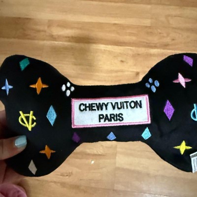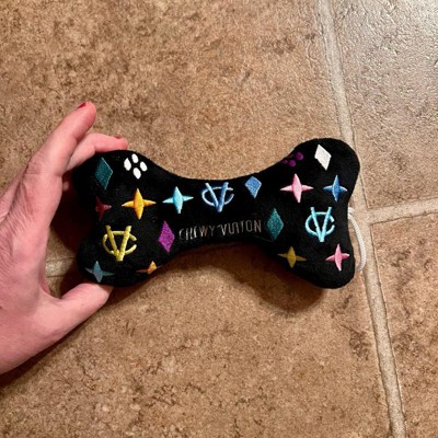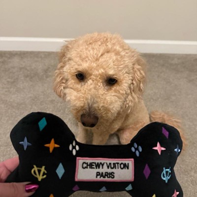[This review was collected as part of a promotion.] I purchased this extra large size black monogram “chewy vuiton” dog bone toy for my adorable, playful mini golden doodle. My little doodle bug is 30 pounds and a HARD chewer. Every soft toy gets destroyed pretty quickly. This was one by haute diggity dog specifies the xl is for tough chewers with a durable mesh lining. She thoroughly loves it!!