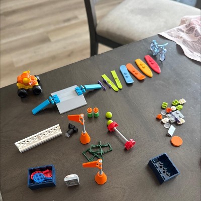 Looking at the picture on the front it’s obvious there’s a motorcycle in the bag, plus a bunch of extra pieces that you can take a guess at what they are to be? THANKS to the reviewer that took pictures of this build completed I was able to copy their build. You get a motorcycle, a bicycle, some parts for a course like a ramp fence etc.. It would be cool if there were some minifigures (people) since there are the bikes & surfboards. Doesn’t come with instructions & I couldn’t find any online so that’s frustrating. Other than that this is a cool little toy & since it’s fairly inexpensive it’s worth buying but I almost feel like this is something I could find at the dollar store.