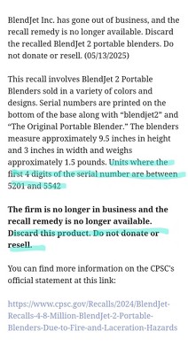 Dangerous Recall on Blend Jet official website on all blendjet 2 with the first 4 serial numbers between 5201 - 5542. People seriously injured from these with mouth and tongue lacerations. Target needs to stop selling these immediately.