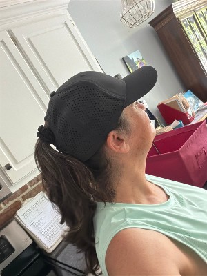 I love this hat. It’s nice to be able to put my hair in a high pony tail. You can also do a lower one too. It helps dry sweat, is super comfy, and looks cute. I’m only wearing this hat from now on
