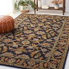The deep navy hue serves as the perfect backdrop for a symphony of intricate patterns, where each design is meticulously crafted to create an heirloom-quality piece. The rug's pattern features a rich tapestry of floral and botanical motifs, harmoniously intertwined and thoughtfully colored with a palette of warm creams, vibrant golds, subtle greens, and hints of red, evoking a sense of stately charm that elevates any room's decor.