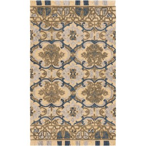 Discover the elegance and luxury of our hand-tufted area rug, crafted with impeccable attention to detail to showcase a stunning gold and blue color palette. This 5' x 8' medium rectangle rug boasts a plush pile height of 3/8", combining comfort with sophisticated style.