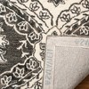 The rug showcases a beautiful ivory pattern on a rich charcoal background, exuding a sense of balance and refinement. The intricate floral and vine motifs draw inspiration from timeless styles, transitioning effortlessly into a range of home decors.