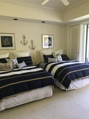 [This review was collected as part of a promotion.] Ashton Duvet Cover Set has a very simple minimalistic color pattern. The white, navy and khaki colored stripes are at different variety of widths throughout the whole set, which is great for catching the eye and offers a pleasing serene feeling. There is a decorative pillow included with this set as well and seems to try and follow the same color pattern but is a little different, white thick stripes with blue cut into it, a thick khaki border, and on the other side is solid blue. This set is on my sons bed and he absolutely adores it. The bedding uses an antimicrobial treatment that provides built-in freshness protection, reducing the growth of odor causing bacteria to keep fabric lasting longer and that’s a huge plus for us.