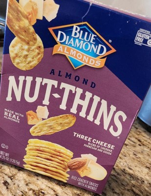 [This review was collected as part of a promotion.] Blue Diamond Three Cheese Nut Thins are super crunchy, almost akin to a rice cracker. The three cheese was tasty, however I deducted a point because my family and I found them a bit salty. I'll be trying other flavors.