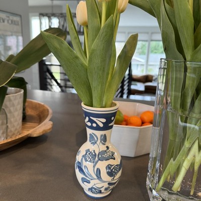 This blue painted bud vase by Threahold is one of those rare finds that looks like it was picked up at a boutique pottery market rather than a big box store. The ceramic base feels hand painted and unique. It has a beautiful perfectly imperfect vibe. It works perfectly with my coastal traditional theme. I love how it looks alone and there are also other pieces to match if wanted.