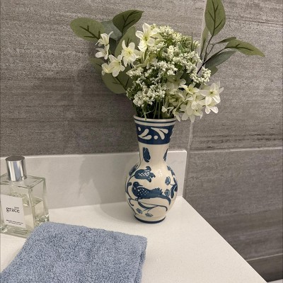 Add charming style to your home with these Blue Painted Ceramics from Threshold™. This painted collection features a large vase, medium vase, bud vase and taper candle holder. Made of ceramic, each piece is adorned with a pretty blue botanical print on a white backdrop that brings fresh appeal to any room. Featuring a watertight construction, the vases are great for displaying fresh or faux flowers, and you can mix and match the pieces on shelves or tabletops to add depth and coordination to your space.