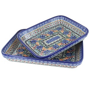 Expand your kitchen collection with this versatile Rectangular Baker Set, perfect for everything from everyday dinners to holiday gatherings. The set includes two essential sizes: the small rectangular baker (10.25" long x 8.12" wide x 1.75" high; 1.5" deep) and the medium rectangular baker (12" long x 9.25" wide x 1.88" high; 1.5" deep) , giving you flexibility for a wide variety of recipes. Use the small baker for side dishes, small casseroles, roasted vegetables, or desserts, while the larger size is ideal for baked pasta or family-sized meals. Each baker is handmade and hand-painted in Poland, decorated with vibrant, traditional patterns that make every piece a unique work of art. Crafted from durable, high-fired stoneware, these bakers are praised for their even baking, excellent heat retention, and easy cleanup, ensuring they?ll be kitchen favorites for years to come. Safe for the oven, microwave, dishwasher, and freezer, they combine heirloom-quality craftsmanship with modern convenience. Whether cooking for two or hosting a crowd, this baker set delivers beauty, function, and lasting quality straight from oven to table.