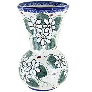 A wonderful shape - a great accent for your favorite flowers! 9.5" high x 5.25" opening The Art of Polish Pottery, as we know it today, started as local folk art centuries ago in the German province of Silesia. The first known pieces of “Bunzlauer” stoneware dating back to the 16th century were crafted by hand and decorated with a folk art stamping technique using potatoes. Original designs were inspired by the peacock feather using the colors of cobalt blue, sage green and ferrous red. These designs and colors are still the inspiration for modern day patterns.Today, skilled Polish artists still individually handcraft and hand decorate each piece using small sponges to stamp each pattern and color. After the process of mixing ingredients, molding the pottery, applying the decorations and glaze, the pottery is twice fired. This process makes the pottery extremely durable, it will not crack or chip easily, and it is perfect for use in the microwave, dishwasher, oven and freezer. Along with our pottery, we have sourced a range of absolutely beautiful hand blown glassware from Poland. It is the perfect addition to your Polish Pottery Collection!