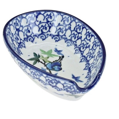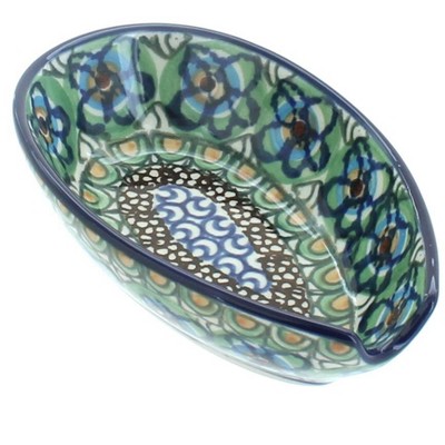 Keep your counters and stovetop clean and stylish with this hand painted Polish pottery spoon rest, a compact yet practical piece designed to hold tasting and serving spoons while you cook or serve meals. Measuring 5 inches by 3.75 inches, it offers just the right amount of space without taking up extra room on your counter. Each piece is crafted from durable, high-fired ceramic and hand decorated in traditional Polish patterns, making it as much a work of art as a kitchen necessity. The intricate designs reflect the centuries-old artistry of Polish pottery, where every brushstroke adds character and charm. Beyond its beauty, the glazed ceramic surface is smooth and easy to clean, so you can simply wipe it down or place it in the dishwasher for convenience. Perfect for everyday use, this spoon rest also doubles as a decorative accent when left on your stovetop or counter. Pair it with other Polish pottery pieces to create a coordinated look, or use it on its own as a statement of handcrafted European artistry.