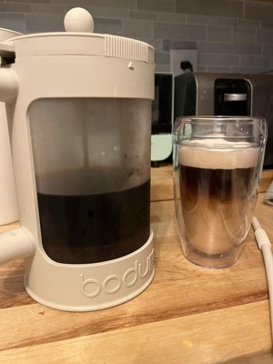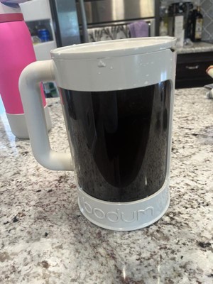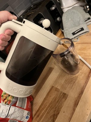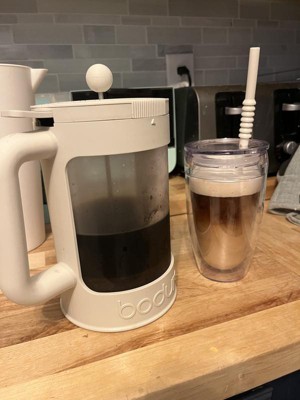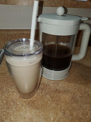 Absolutely pleased with this Bodum Cold Brew Coffee maker. The process for making the cold brew is incredibly simple: Scoop as much coffee grounds as you like based on your preferred strength, fill with water, give it a quick stir to submerge all the grounds, put on the lid, and set aside! While the directions say to put in the fridge to brew, I actually prefer to leave mine on the counter for about 24hrs, and then it's ready to drink for me, which is when I put it in the fridge. The directions on the amount of coffe to use are a little vague, but they do say simply use double what you normally would, so that seems like it should give you an idea of how much to use. I find that most people will trial and error that piece anyway, until they find their preferred strength and taste. I also really like the cups that come with this set. They are really cute but also prevent the dreaded sweating most plastic cups do when you add an iced drink to them. That's the double wall construction at work there. Just a nice little extra touch that you could tell there was thought put into it.