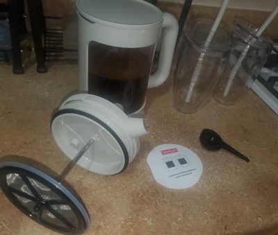 I love this cold brew maker! It’s so easy to use, coffee tastes great, and is saving me from buying $5+ premade bottles a couple of times a week. Super easy, use the included scoop and put coffee grounds into pitcher, I put about 15 scoops, then add water, stir, put on the included lid and let it sit in the fridge for 12-24 hours. When ready, put on the French press lid and press the grounds to the bottom, the push the lever to pour coffee into included double walled insulated cups with lid and reusable straw. It’s perfect! My only complaint is the French press can be hard to press down. Other than that, this is my go to cold brew these days!