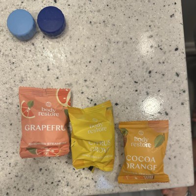 [This review was collected as part of a promotion.] I absolutely love these Body Restore Shower Steamers. The citrus scents are refreshing and energizing. They are perfect for a morning pick me up. Each pack includes a nice variety of individually wrapped shower steamer tablets that include 2 citrus grove which gives off a nice lemon scent, 2 orange, and 2 grapefruit. As long as the tablets are kept away from the direct water stream, they will last 30-45 minutes. These steamers are totally worth the splurge for a big boost of self care, and as a bonus, they made my whole upstairs smell like a citrus spa! I received an incentive to write this review.