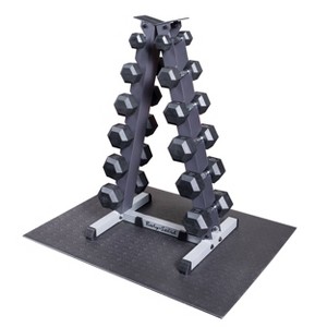 Body Solid GDR44-RFWS Package: GDR44 - Solid and stable, this space efficient 6-tier vertical dumbbell rack holds 6 pairs of hex dumbbells. Body-Solid 6-Pair Vertical Dumbbell Rack The uniquely designed 2-tier vertical dumbbell rack holds 6 pairs of hex dumbbells. Each level is off-set, allowing unrestricted access to dumbbells. Place it against a wall or center it in a room. Heavy-gauge steel construction offers maximum durability and better performance in less space. Best used with hex dumbbells up to 35 lbs. only. If used with SDR rubber coated hex dumbbells, they may sit at an angle due to the thick handles. Body-Solid In-Home Warranty 23" L x 25" W x 45" H, 44 lbs. The uniquely designed Two-Tier Vertical Dumbbell Rack holds 6 pairs of hex dumbbells. Each level is off-set, allowing unrestricted access to dumbbells. Place it against a wall or center it in a room. Heavy-gauge steel construction offers maximum durIility and better performance in less space. Package includes GDR44 4 Tier Vertical Dumbbell Rack, 5-30 lb Rubber Dumbbell set, and RF34B Rubber Equipment Mat.