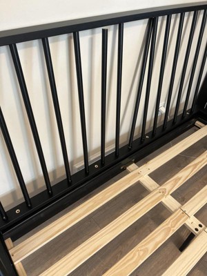 The spindles get screwed in on one side and get lightly wedged to the other side. The bed got shook one and now all the spindles hang freely and if you screw the spindles too tight the screws pop thru to the top, which looks bad and is unsafe. At least the bed doesn’t squeak but I’m very unhappy. I’ve also bonked my shins along the edge multiple times. I have a queen and it doesn’t fit snug into the slats. I can see the pine at the bottom along the edges