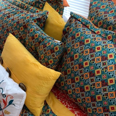 This is so pretty and comfy! It doesn’t get all wrinkly like most comforters, the material is nice as soft, and the colors are vibrantly gorgeous! Definitely recommend! It also seems a little wider than the typical queen, so it actually covers the mattress on top of a box spring that is normally slightly exposed on my bed frame. The pillow shams have zippers and are surprisingly soft to sleep on - normally shams are purely decorative. There are four but only two are shown. In the photo. It is DRY CLEAN RECOMMENDED; however, I washed on DELICATE cycle with no issues in my Samsung Smart Top washer with an agitator. People are saying the threading is coming undone or color fades after one wash. Just wash it on delicates in cold and it will remain intact. The square pillow is too 70s retro, so it’s not in the photo, instead it will go to a thrift store or friend.