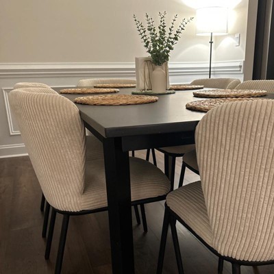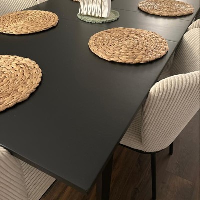 I have been looking for a black table for some time. I never expected to find it via Target. I like it a lot! Assembly was not too bad. I just had to call my friend to flip it over after I attached the legs because the table is heavy. I wish this has self-storing feature for the extension. At first, I was concerned with the condition of the box when it arrived. Thankfully, I have not seen any issue. I do hope it lasts long (looks like it will)!