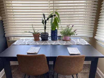 I’ve had this table for just over a year and wanted to share my experience. I have a 2 year old and we eat at this table pretty much every day. Out of the box the table looks really great and it’s built really well. However, if you plan to actually use the table, know that it scratches very, very easily. Additionally, just the other day I pulled a Pyrex dish out of the oven and put it on a towel on the table. It ended up burning the black paint off the table and now we have a white/light grey area where the Pyrex dish sat. I couldn’t believe it. Because of that, there’s no way I would buy this table again.