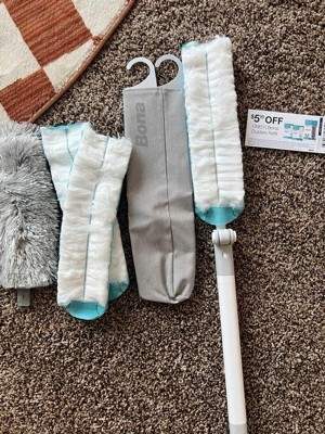 [This review was collected as part of a promotion.] The Bona Extendable Dusting Kit has significantly improved my home cleaning routine. This is exactly what I needed to tackle those hard-to-reach spots like ceiling fans and corner cobwebs. The duster extends effortlessly up to 6 feet and pivots, allowing me to clean high areas without having to precariously balance on a chair or ladder. One of the standout features for me is how much dust the reusable duster collects. It picks up a surprising amount of dust, making each cleaning session much more effective. Plus, the reusable duster is incredibly easy to clean, which adds to its convenience. I appreciate how easy it is to change the dusters, and the reusable one washes up well, maintaining its effectiveness over multiple uses. I also love the cover that comes with the kit. It has a built-in hook, which means I can hang it on a wire shelf or closet rod. This keeps the duster within easy reach, making spontaneous cleaning sessions hassle-free. No more dragging out a bulky vacuum or climbing up a chair to swipe at cobwebs with a rag. The Bona Extendable Dusting Kit has made my cleaning routine so much easier and more efficient. I no longer look at ceiling fans and corner cobwebs with dread. Highly recommended for anyone looking for a practical and effective dusting solution!