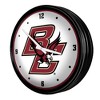This premium Boston College Retro Lighted Wall Clock will be sure to add the finishing touch to any room in your home or office. This piece is injection molded and features a high-resolution, high gloss digitally printed face. Comes with an 8 foot power cord and an on/off pull switch for the light. LED illuminated. Hanging hardware and light bulb included. This is an officially licensed product of the Eagles and made in the USA.
