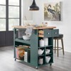 Expand your counter and storage space with the Boston Kitchen Cart from angelo:HOME. Multiple spaces for organizing your kitchen essentials such as serving bowls, bakeware, cookbooks and more. The four compartments have two adjustable shelves for storing varying sized items. The side stainless-steel towel bar provides convenience while the castors (2 that lock) enable easy mobility. Finished in a striking Dark Hunter Green, this cart is accented with a solid natural rubberwood top.