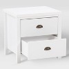 Classic lines with rustic details, the Boston two-drawer nightstand is the perfect place to tuck away your belongings. A welcomed addition to any aesthetic, it showcases a clean-lined frame and a classic finish. Providing ample space for remote controls, books, and any other bedside essentials. The two drawers run smoothly on metal glides, and each one features a gunmetal cup pull handle. Add the matching dressers from this collection to complete your bedroom set.
