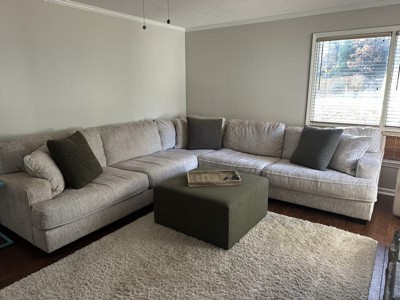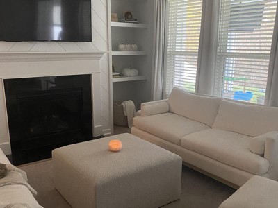 Love this ottoman! It's huge so you need make sure you have room. I currently have a huge living room and it fits perfectly. Gives my kids and grandkids a extra space to sit A perfect place for my oldest so rest his feet when he's playing video games. It's also big enough you can play a board game on it! I was worried about it being oatmeal with so many little kids. However the the texture is almost like carpet and I think it'll be easy to spot clean. The pictures doesn't do justice because you can't see how great the texture is. Also it's really big but also light enough to be moved around the room. Because it was so big they set up delivery so be prepared for that. It came in two boxes on a pallet.