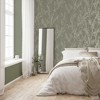 A full roll of this product is 20.5 inches wide and 396 inches long. A full roll can cover up to 56 square feet depending on the design match and pattern repeat. A sample of this product is 8 inches by 11 inches. A beautiful design featuring overlaid branches in shades of matte and metallic create a beautiful serene feel in soft sage green and gold combination atop a woven texture with shimmering undertones