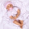 Youll be saying, Oh, how cute! when you see our little Bow Cute! This realistic infant baby girl doll looks forward to a fun-filled day with you. Pretty in pink, Bow Cute wears a white graphic onesie with a printed heart decal and pink edging. Her delicately hand-painted light brown hair is kept under a pink and white striped knit cap. She also wears a diaper and comes with a pink magnetic pacifier. Swaddle her in her pink cotton blanket with gray and pink bow print to help put her to sleep.Bow Cute is lovingly sculpted by world-renowned doll artist Michelle Fagan. This lifelike newborn girl doll is a part of our Swaddler Trio. This baby girl doll is 18 inches from head to toe, crafted from SoftTouch Vinyl with a weighted cloth body for that wonderfully lifelike feel with a fresh baby powder scent. Arriving to you in a Collectors Box along with a numbered Certificate of Authenticity with the artists signature. Intended for reborn doll collectors aged 3+.