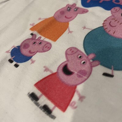 I don’t write reviews but when I got this product, I had to. It was such poor quality. Everything was blurry and to top it off, there was a piece of thread on top of Peppa. As you can see in my photo, once I removed the thread, there is a noticeable line. Such a waste of money for an expensive shirt. I will definitely be returning.