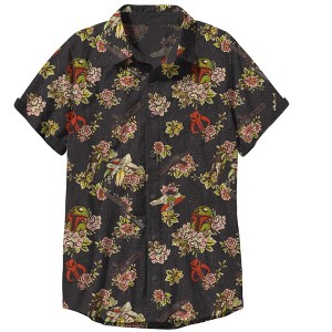 • Own the moment with this stylish new boys' short sleeve shirt that is perfect for every occasion! Featuring an allover print of Grogu, Din Djarin, and the Bantha logo amongst a floral Hawaiian print.