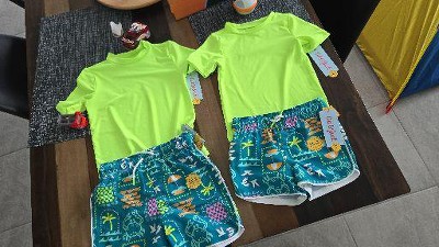 I bought two of these. One in green and one in blue. They are very bright! They don’t match well with all their swim trunks because of the brightness but they are great for spotting your kids in a crowd.