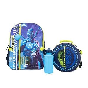 - BLUE BEETLE 4 PIECE SET FOR KIDS - This Blue Beetle backpack set is essential for your BACK TO SCHOOL superhero! The set includes a 16 inch backpack with zip front pocket featuring Blue Beetle character art, a detachable EVA molded lunch box, water bottle, & a fidget squish ball.