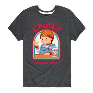 Chucky - Innocent Wanna Play - Toddler & Youth Short Sleeve Graphic T-Shirt - Unleash the terror of a horror classic with Child’s Play graphic apparel, featuring chilling designs inspired by the infamous killer doll, Chucky. From his innocent beginnings to his most sinister moments, each piece captures the twisted humor and slasher thrills of the cult-favorite film. Perfect for horror fans who like their scares with a side of mischief, this collection brings the nightmare to life in bold, unforgettable style.